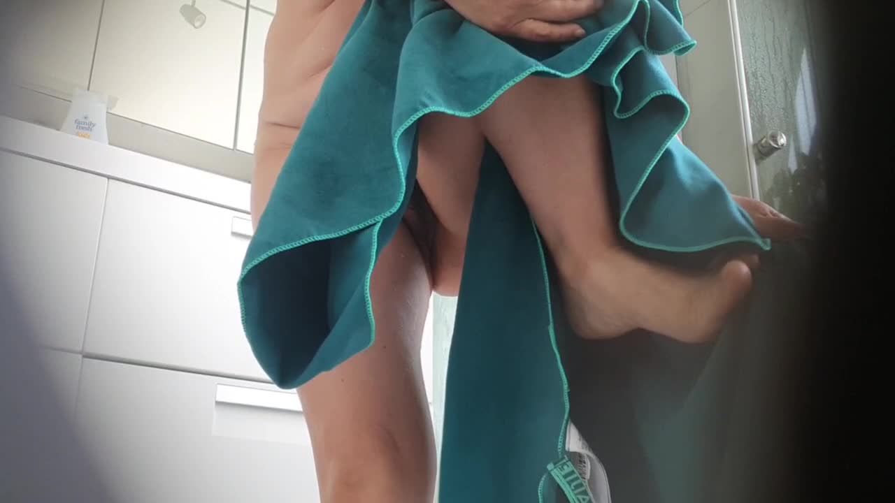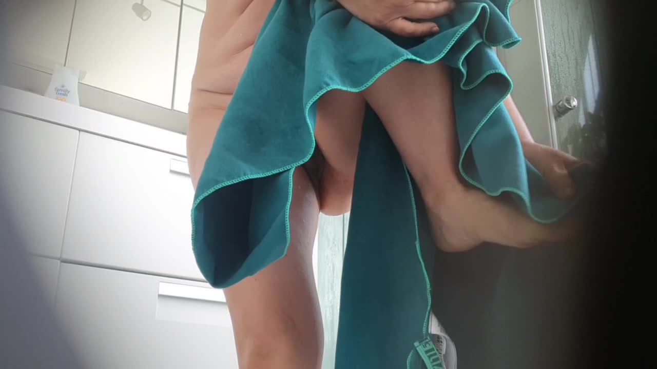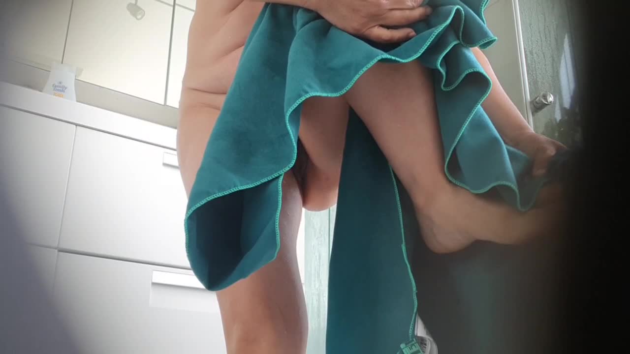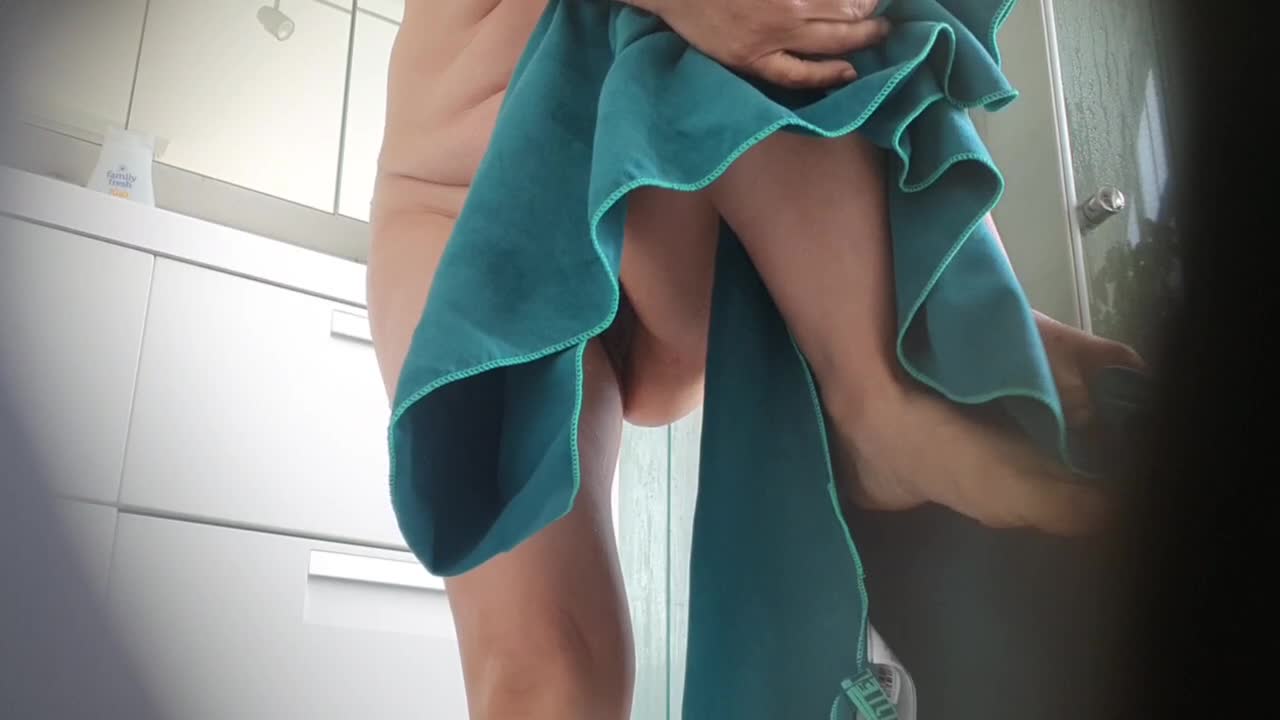 Зрелая пышная дама тчательно вытирает свое тело после душа, не подозревая о спрятанной камере.