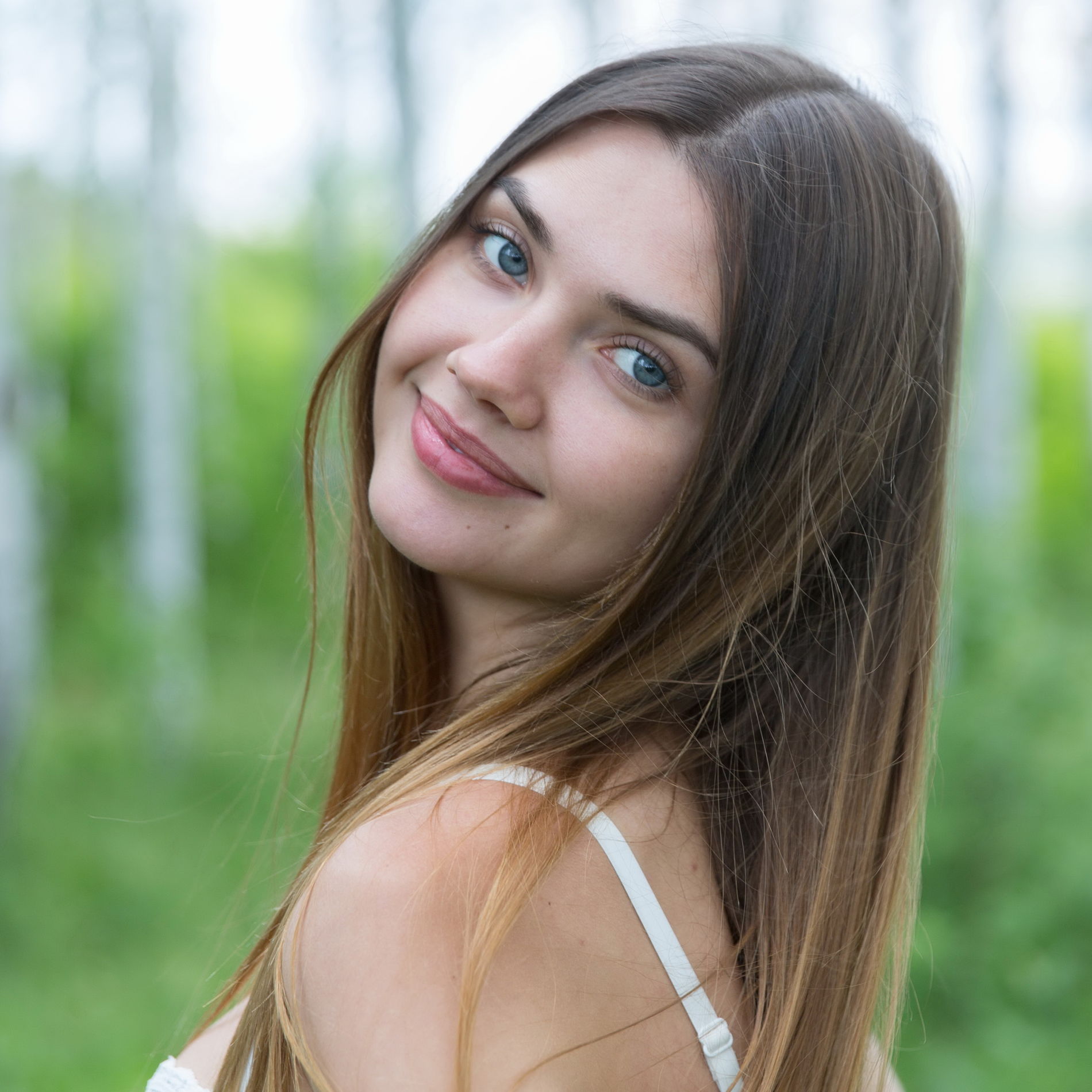Стройненькая девушка среди берёз, сама похожа на эти тонкие и родные нам деревца.