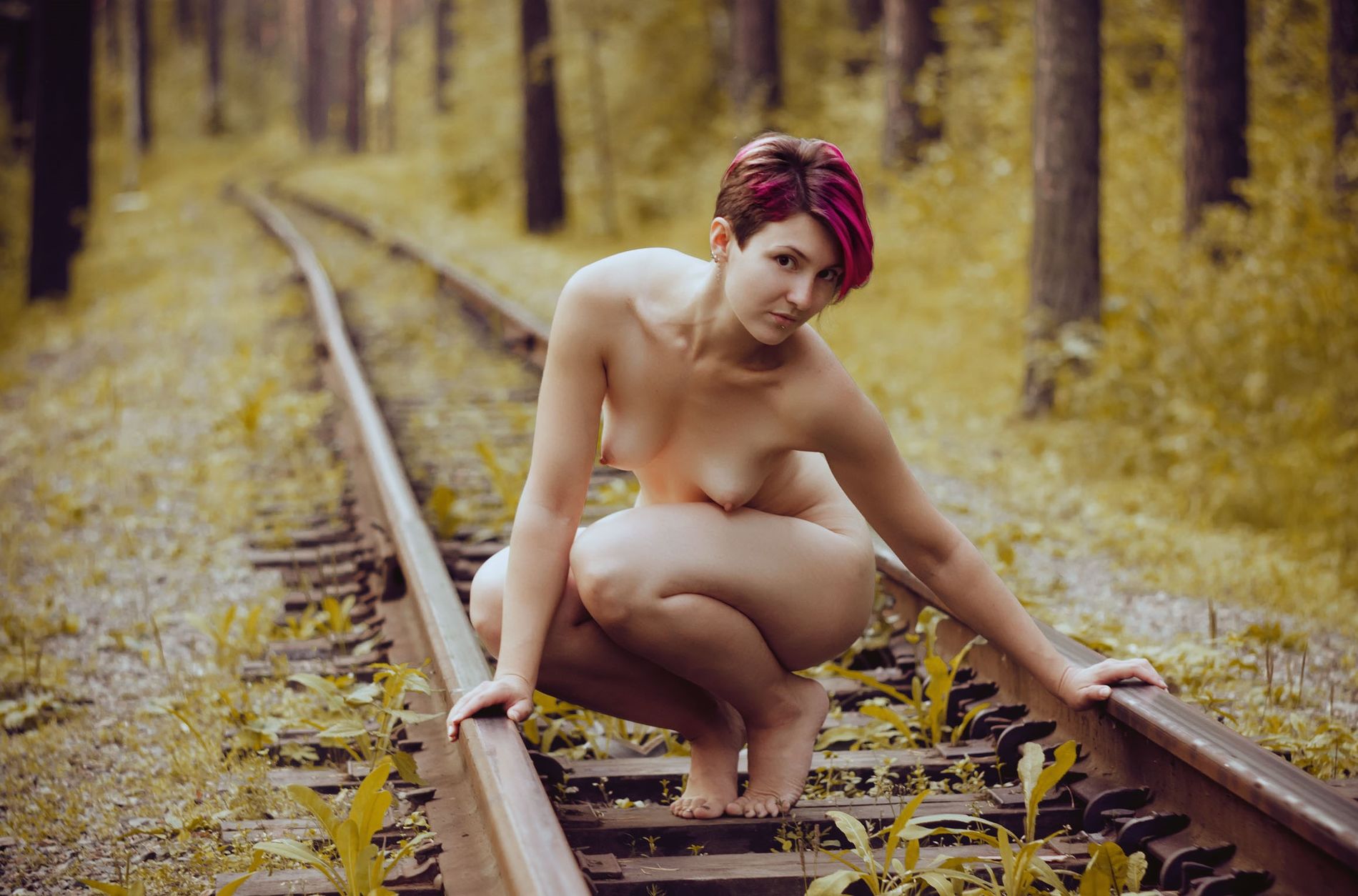 девушка с лиловыми волосами показывает нам свою красивую фигуру с аккуратными сисечками и улетной попкой