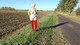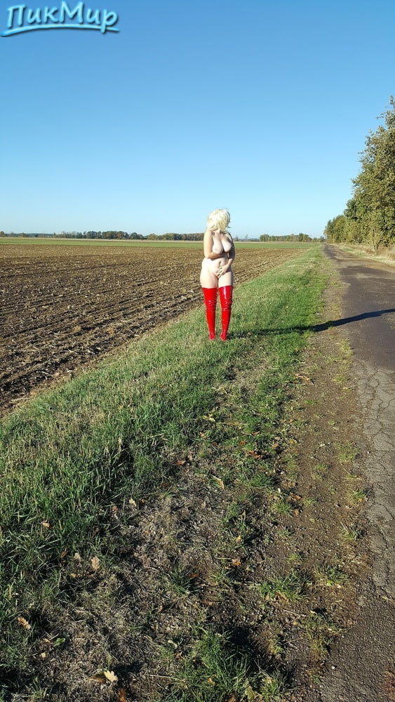 Женщина позирует на весеннем поле только в одних ботфортах , при таком теле и они лишние