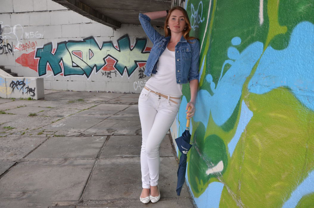 Девочка на фоне стены исписанной графити грациозно задирает блузку и снимает брюки, демонстрируя свои заманчивые прелести...