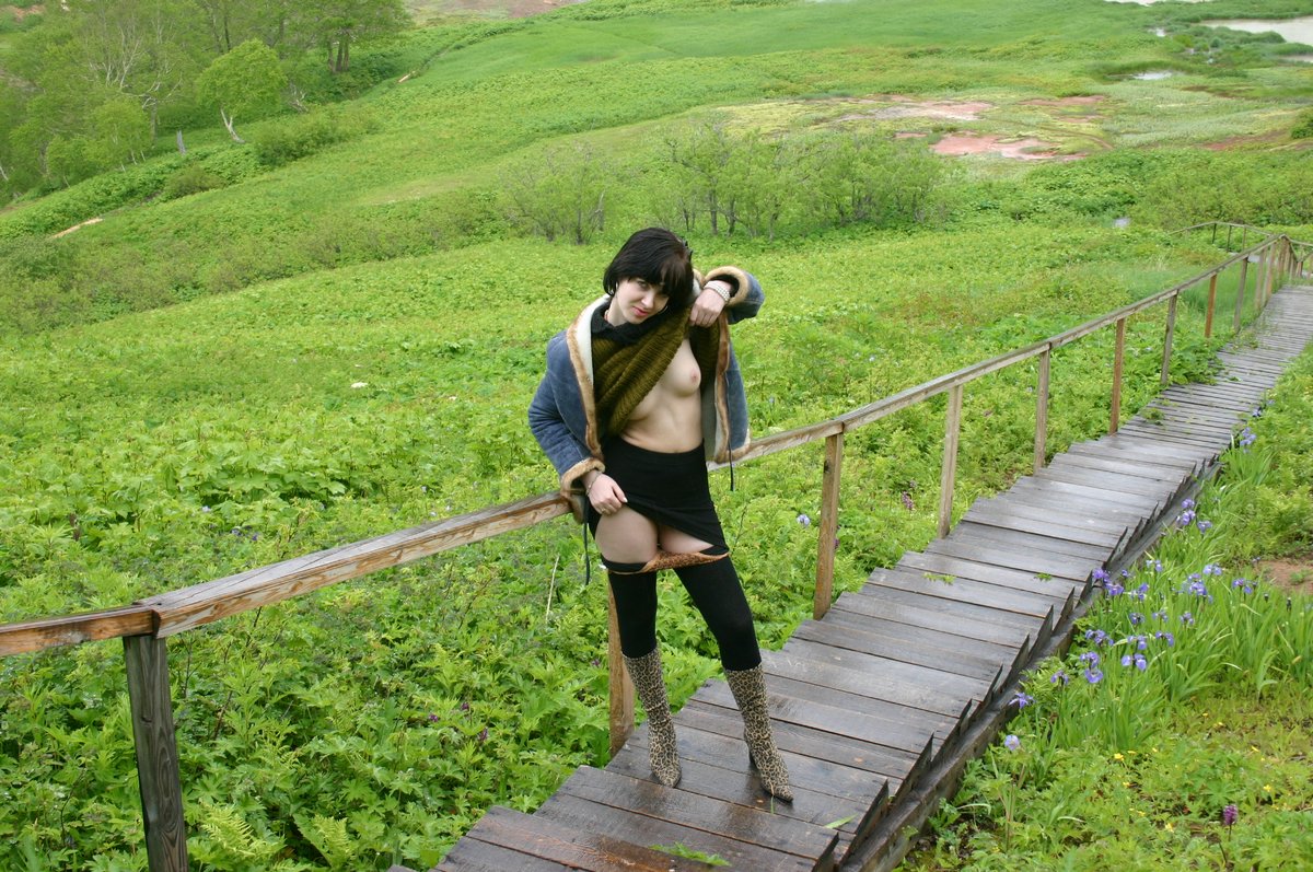 Девушка позирует на фоне красивой природы, показывая стройное соблазнительное тело