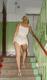 Длинноволосая блондинка откровенно позирует в подъезде. То в коротком платье, то в чулках сеткой. И просто на улице.