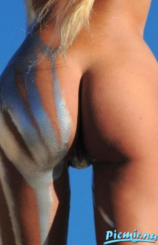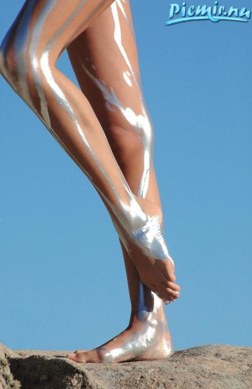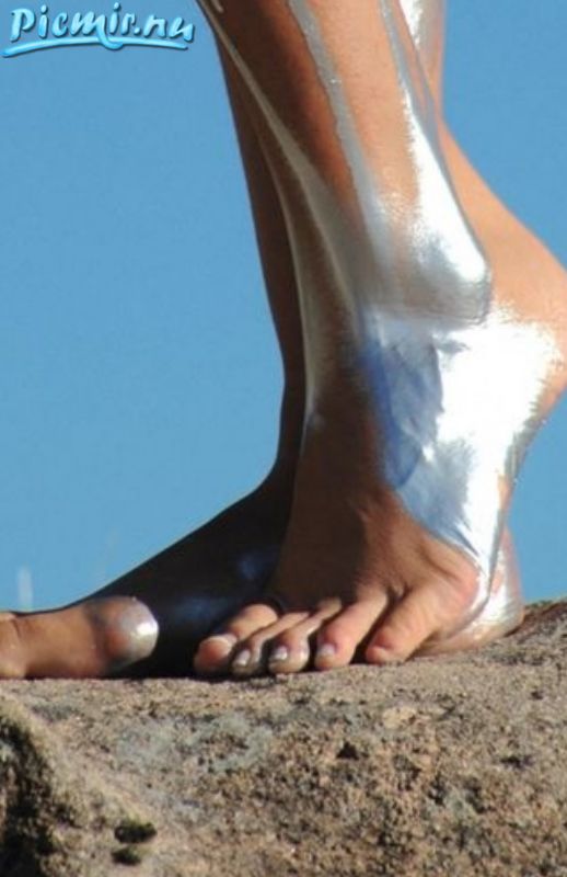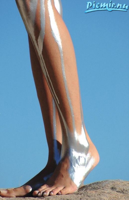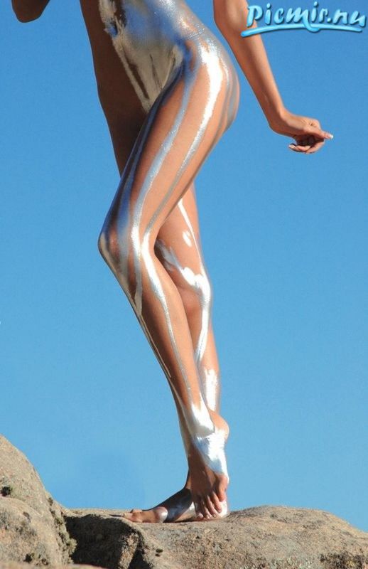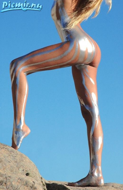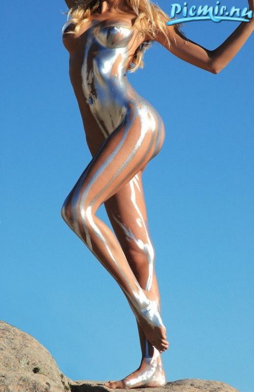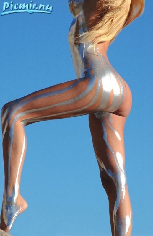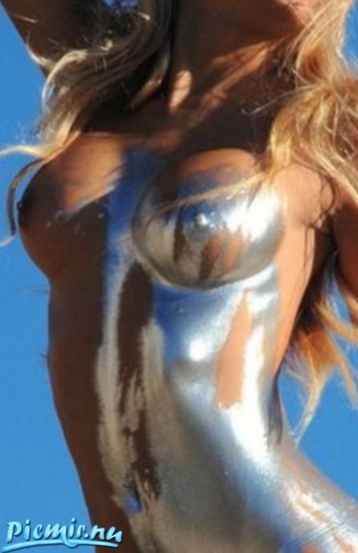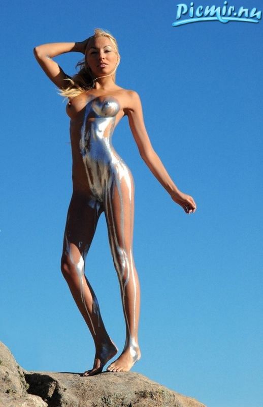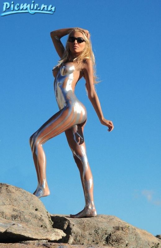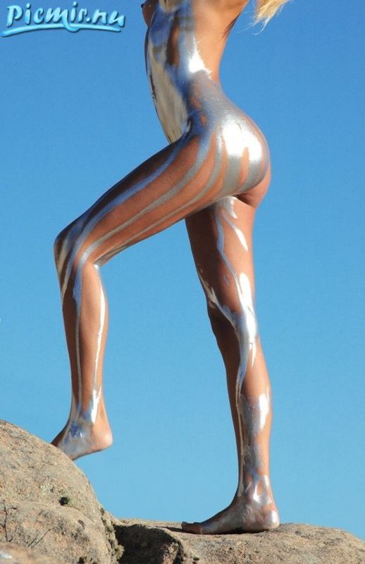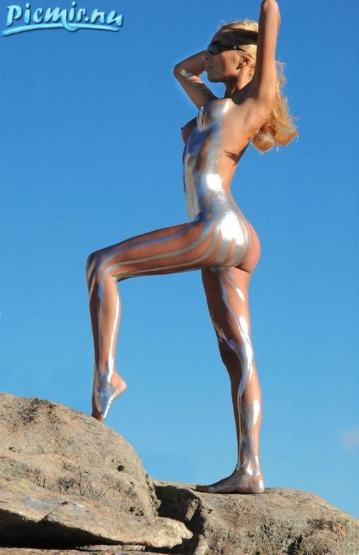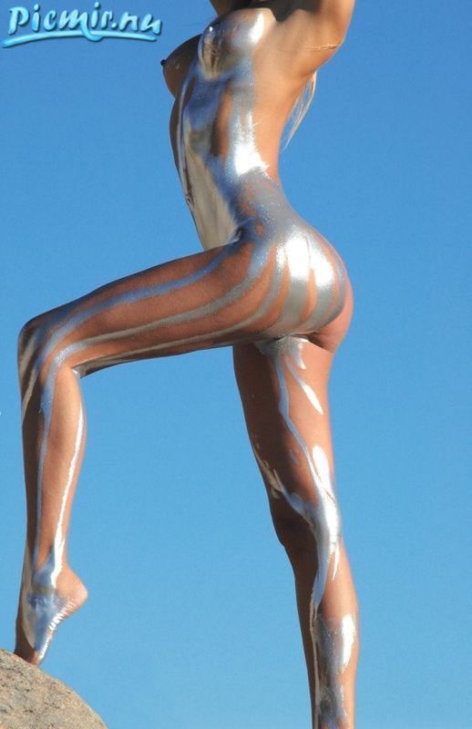 Стройная девушка раскрашенная серебряной краской позирует голая на природе