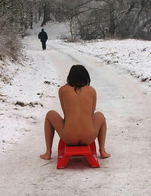 Брюнетка голышом катается на санках.