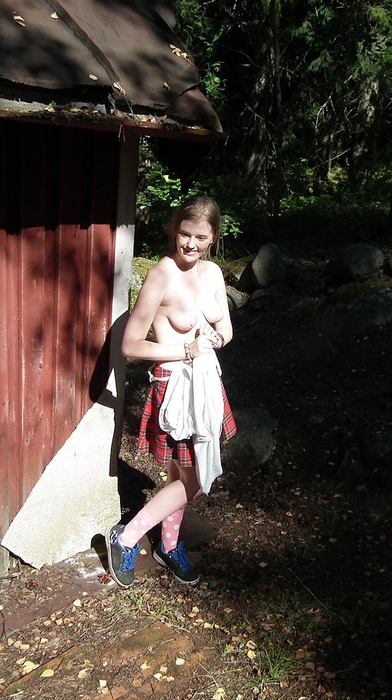 Эвелина показывает свои сиськи и киску в заброшенной хижине