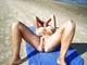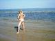 Уже не молодая, и местами потрёпанная женщина позирует на берегу моря.