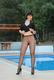 Симпатичная зрелая женщина в чёрных сексуальных колготках позирует окала басейна