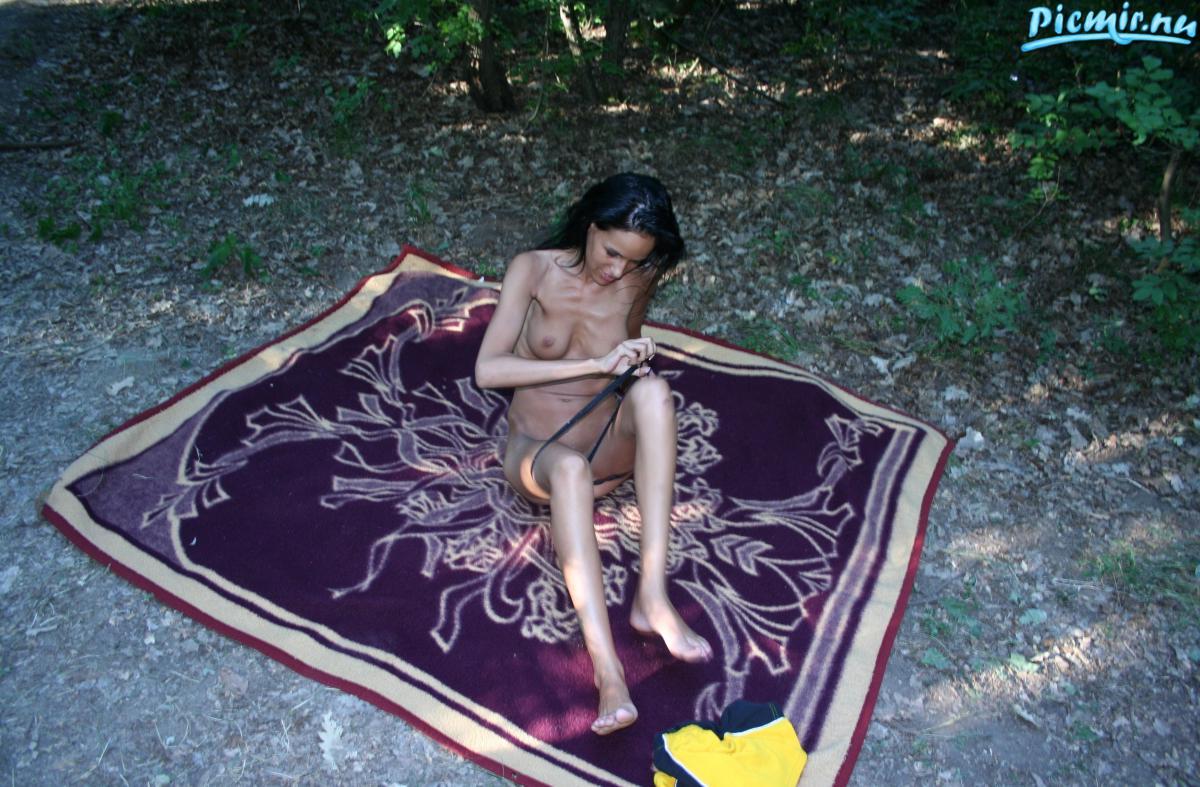 Симпатичная смугляночка подстелив под себя коврик разделась на природе и показывает нам прелести своего худенького тела!