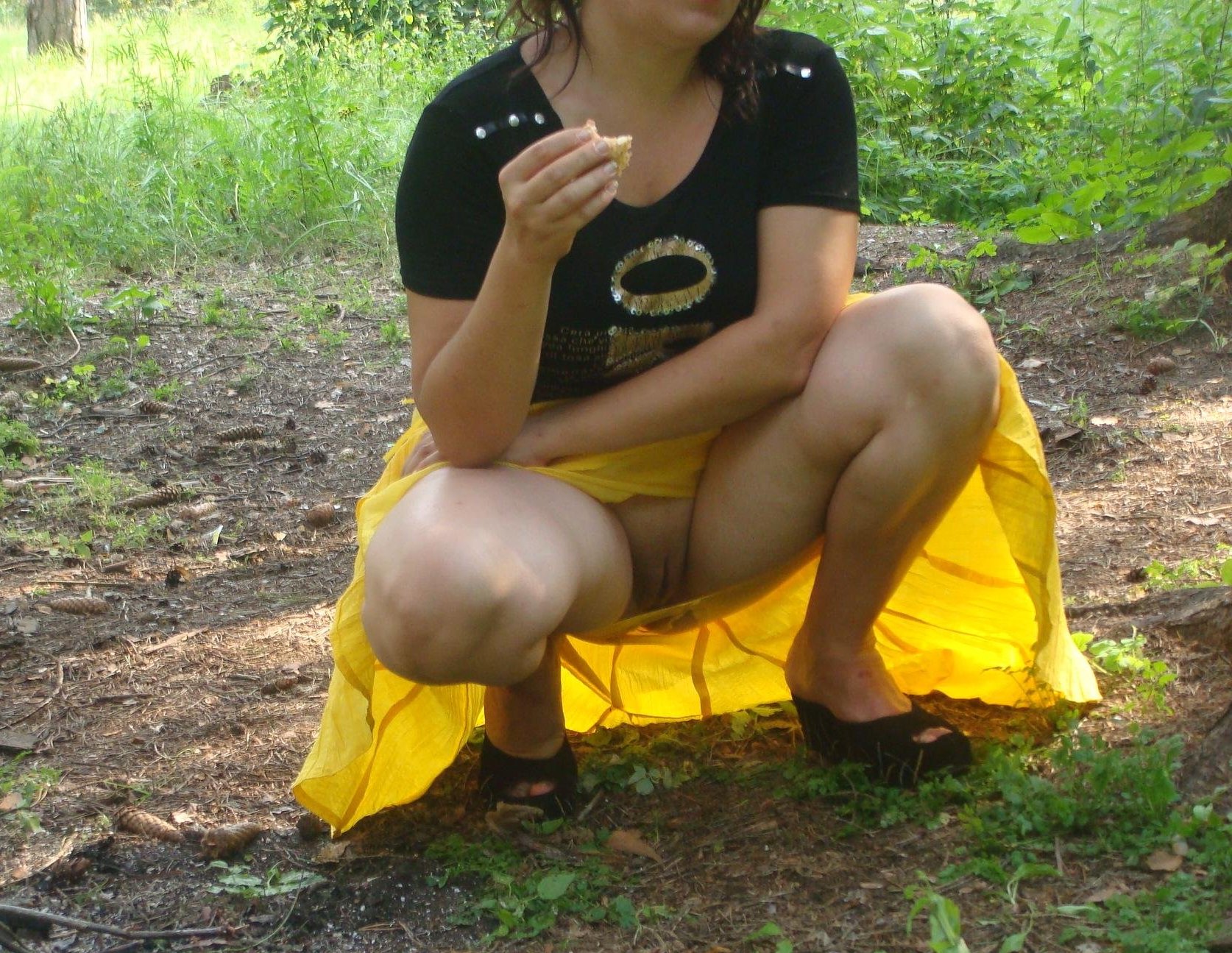 Развратная шатенка одетая в желтую юбочку выбралась на шашлыки. Естественно не обошлось без откровенной фотосессии и минета.