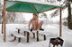 Девка залезла на стол и выдала мощную струйку, а потом там будут шашлыки жарить...