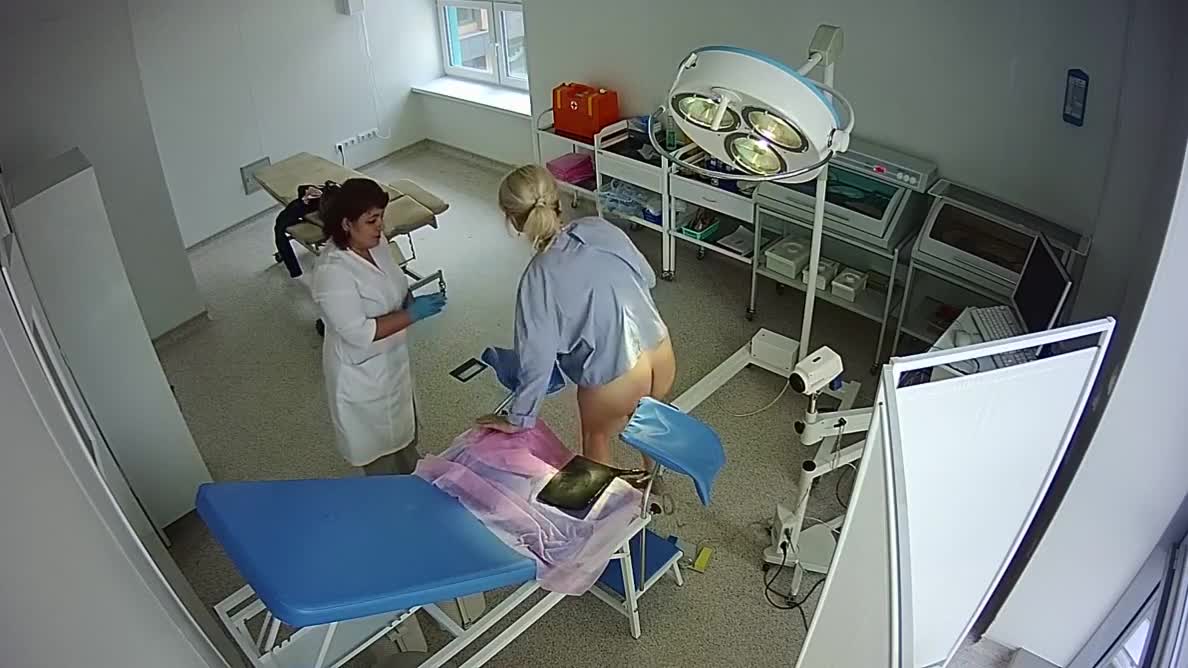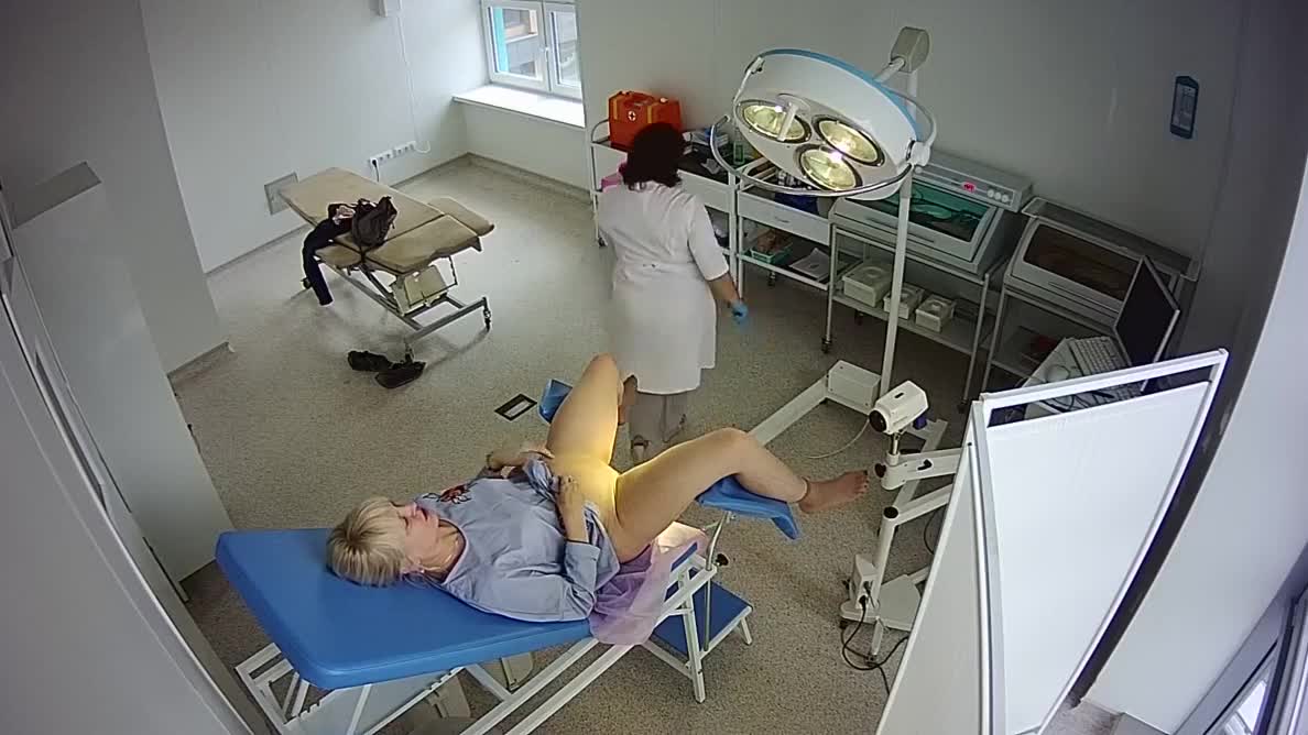 Молодая девушка и дама средних лет проходят медицинское обследование на гинекологическом кресле.Осмотр снимает скрытая камера.