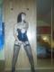 позирует в кожаном корсете в чёрных чулках с хлыстом