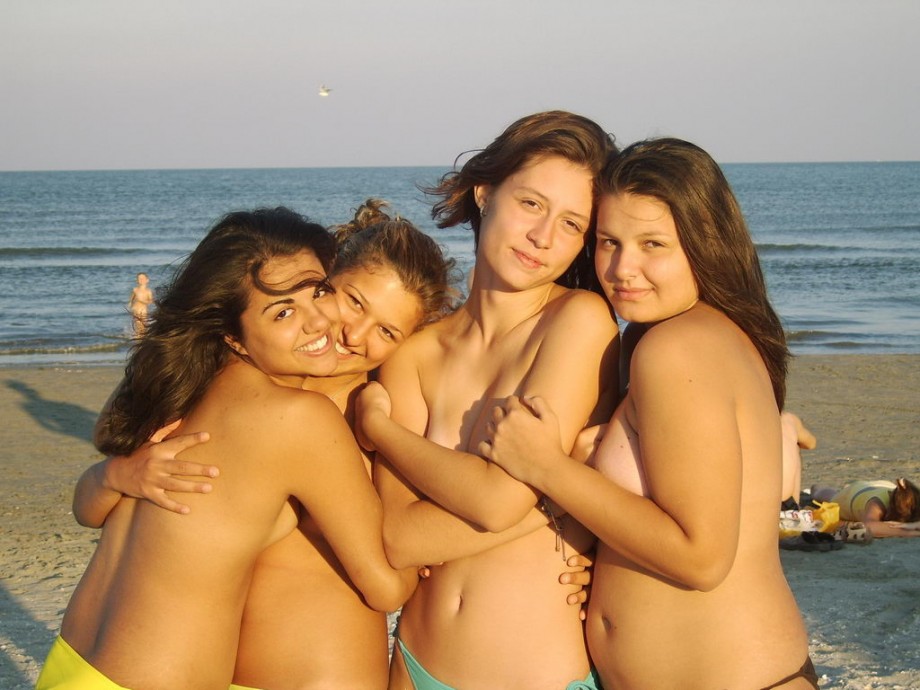 Красивые девушки с приятными формами отдыхают на пляже и фотографируются топлес.