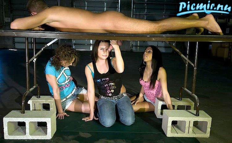 Три девочки приютились под столом и насасывают член лежащего на столе парня.