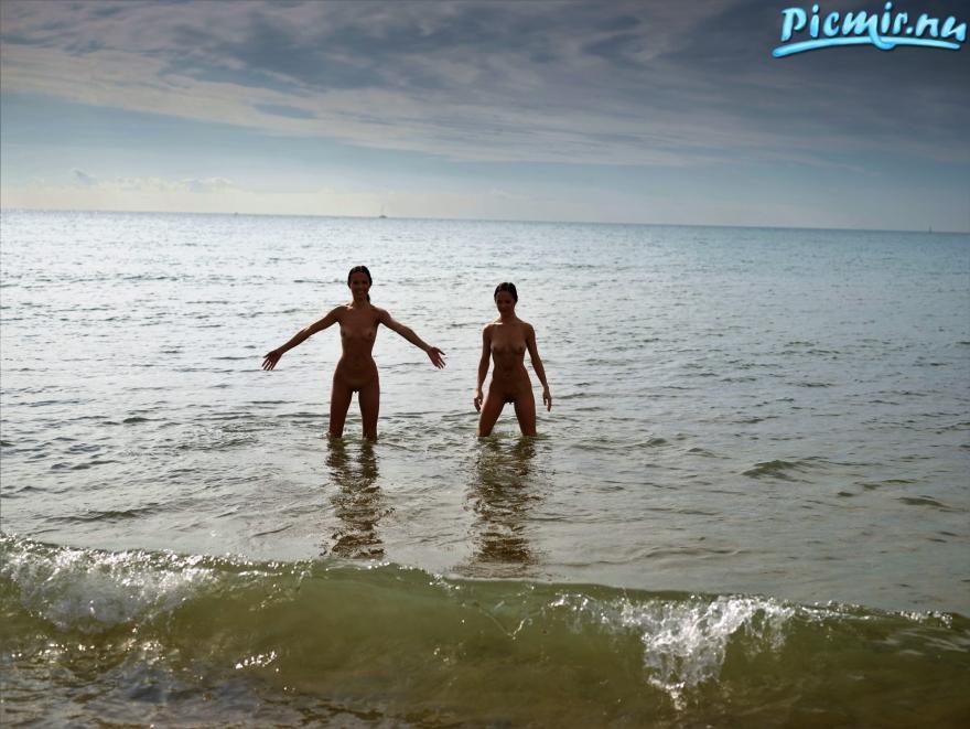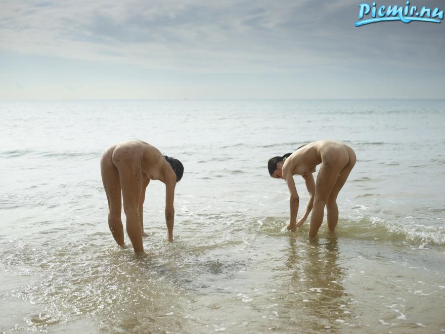 две сестрёнки на морском берегу толи дурачатся толи гимнастикой занимаются
