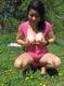 Красивая брюнетка с упругой попкой мило позирует на природе.