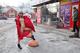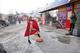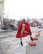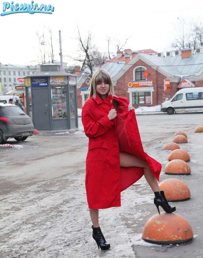 Симпатичная девочка в крсном плаще вышла в горд на прогулку чтобы проветрить и показать свои прелести...