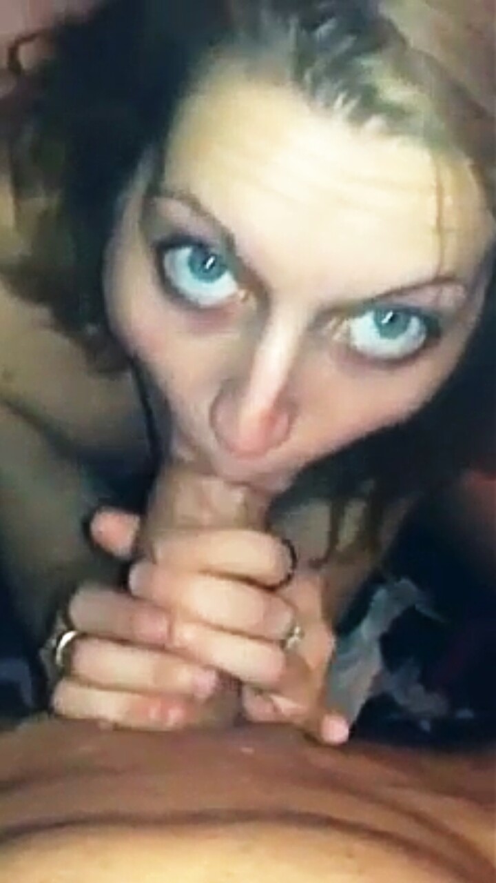 Светлоглазая женщина с огромным энтузиазмом обрабатывает ротиком член партнёра, доводя его до оргазма..