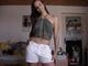 Стройная красивая девушка неплохо позирует у себя в комнате.
