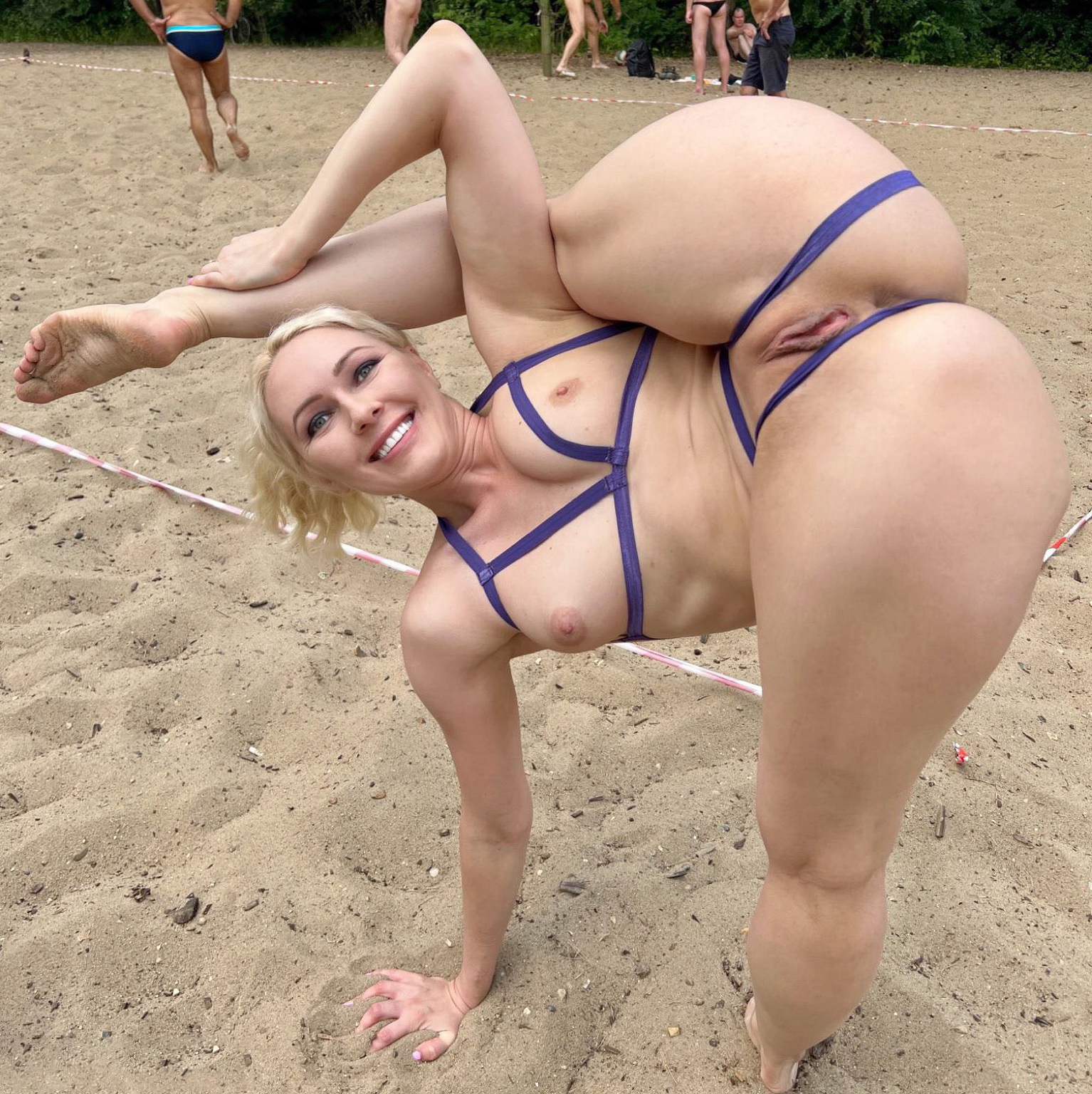 Блондинка с хорошей растяжкой демонстрирует свои интимные красоты на рядом с мужчинами.