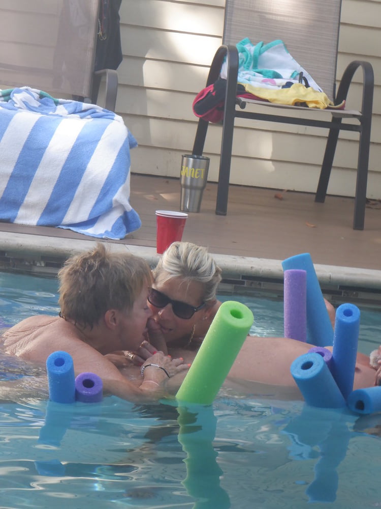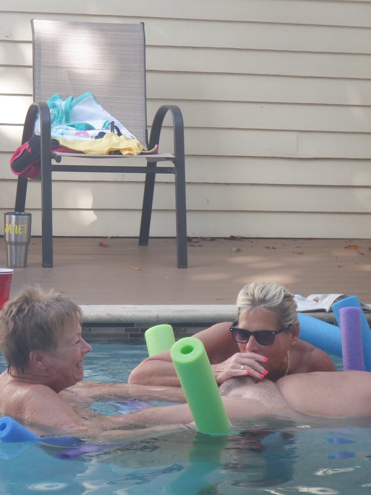 взрослая блондинка поплавала в бассейне и отсосала вместе с подружкой мужику расположившимся на надувном матрасе.