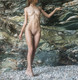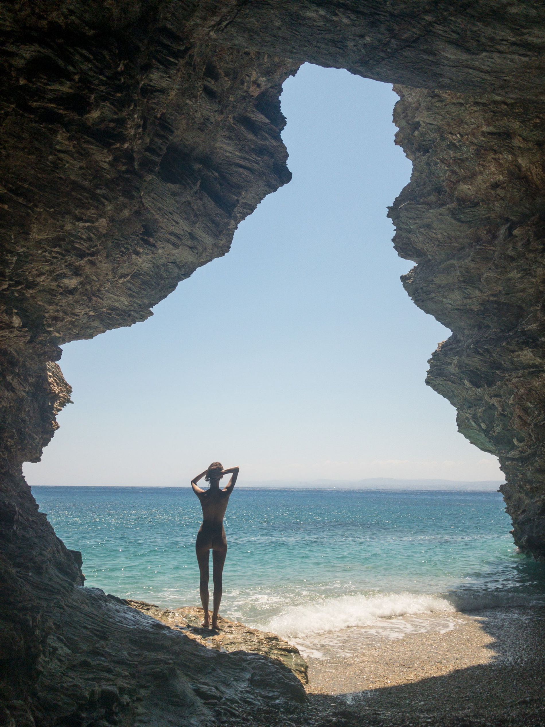 отдыхая на море стройная обнажённая девушка фотографируется в уединённом гроте