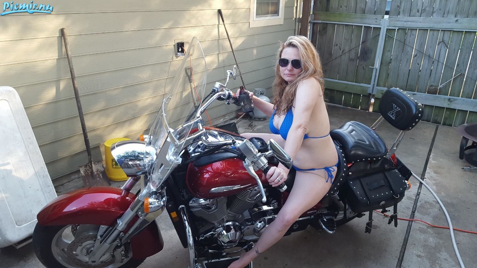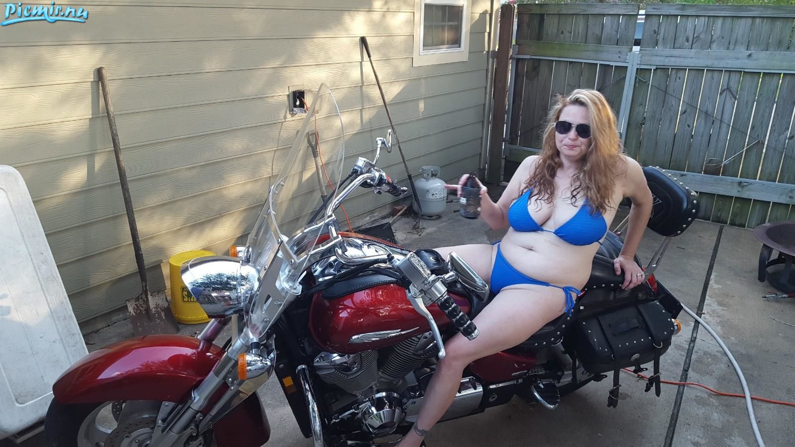 Классно смотрится голенькая байкерша на железном коне, такая пухленькая, сисястая, аппетитная!