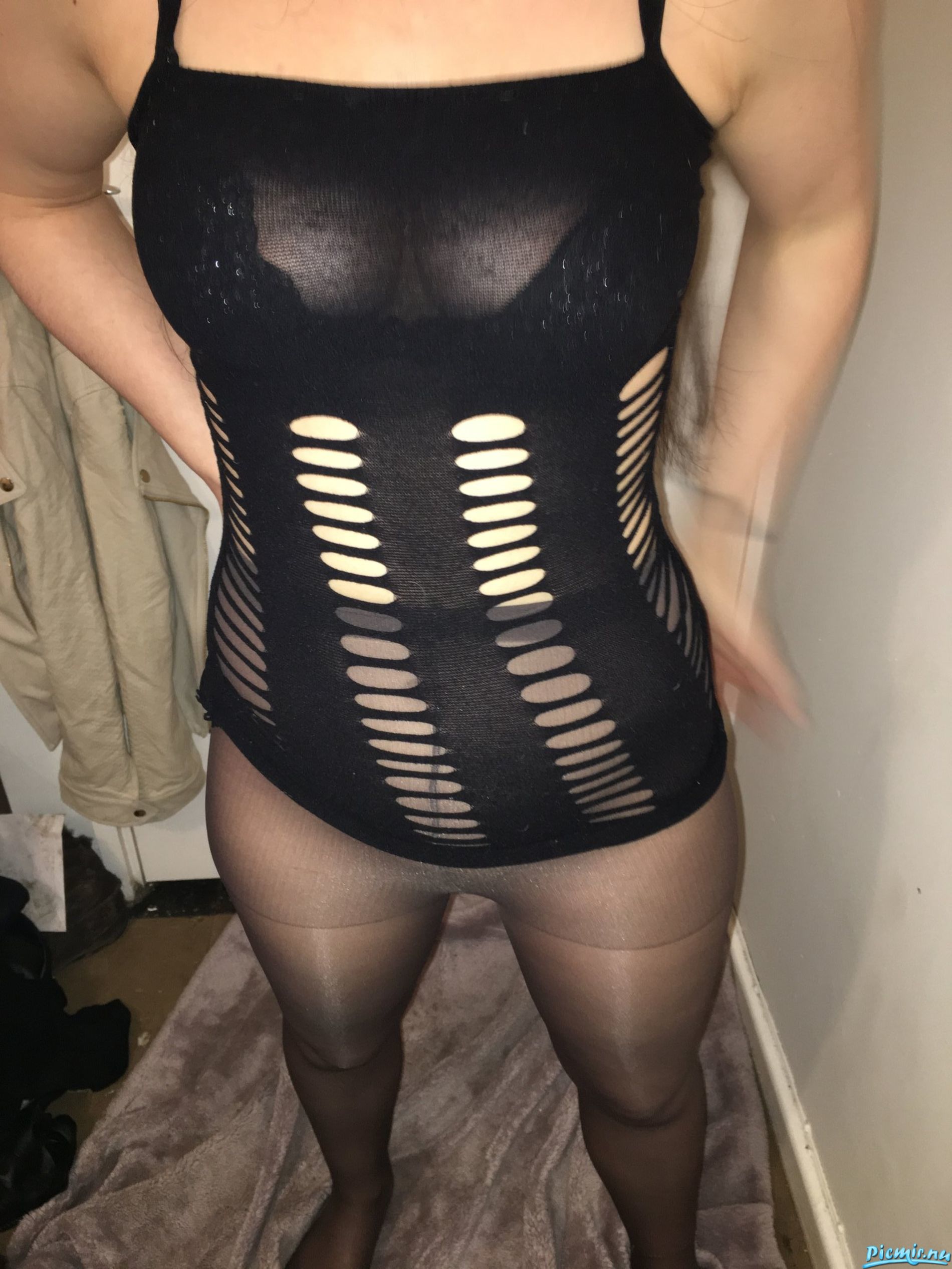 Какая прелесть! Так возбуждающе выглядят ее ножки, попка и пиздочка в черных колготках!