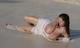 Безупречная женщина омывает свою умопомрачительную грудь в морском приливе.