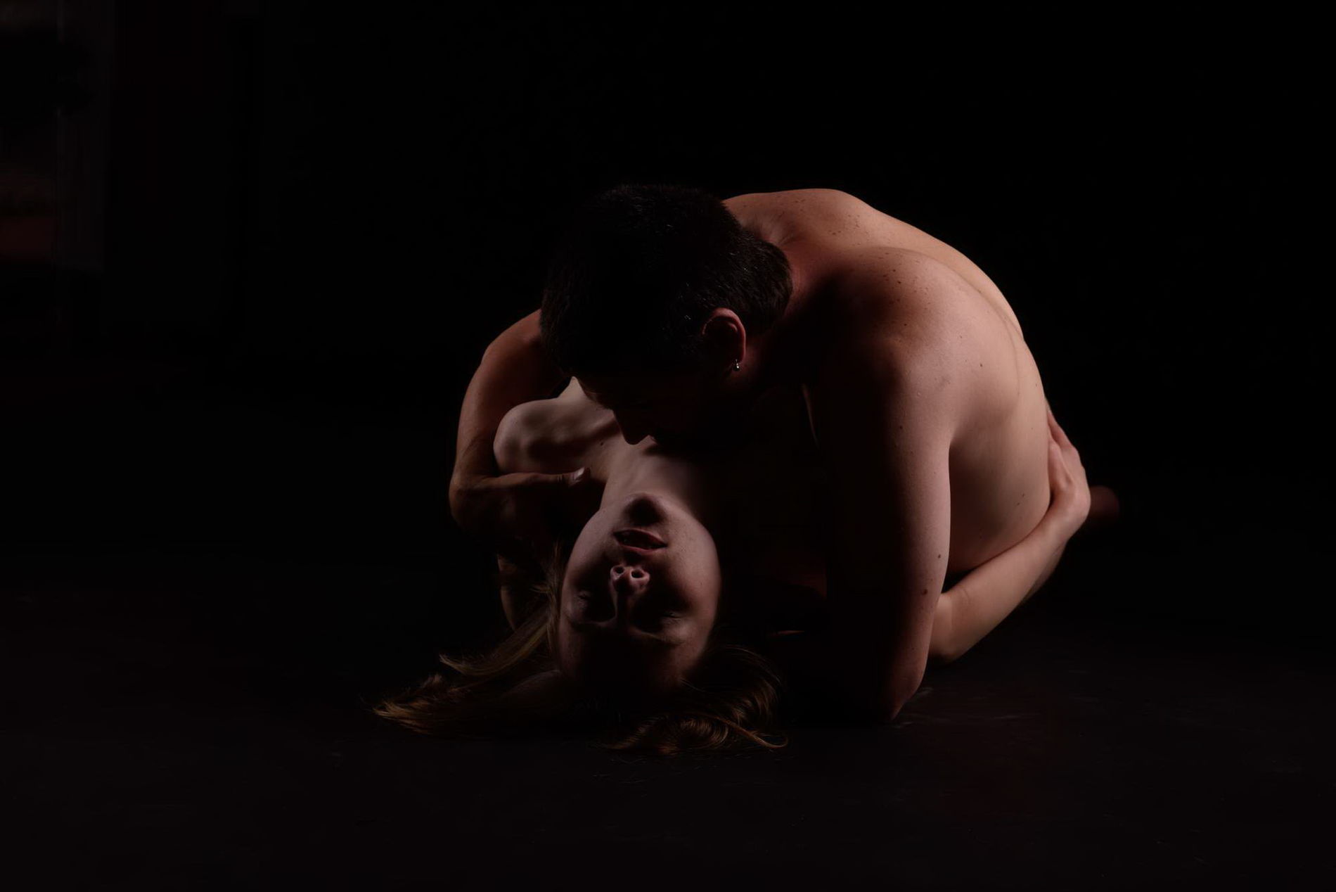 Голые парень с девушкой на чёрном фоне.