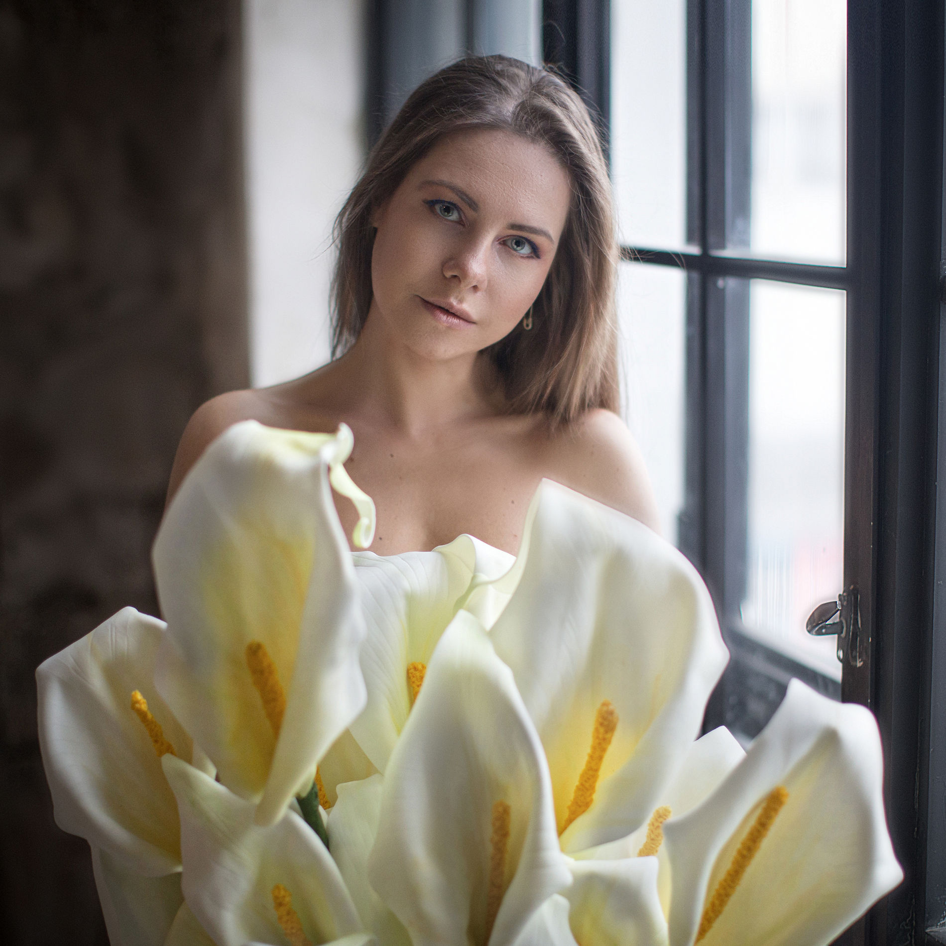 Композиция взяла задушу, милая девушка, красивые цветы, ласкающие взор изгибы юного тела, еще бы увидеть рядышком раскрытый белоснежный бутон цветка калы и раскрытый розовый бутон ее писечки!