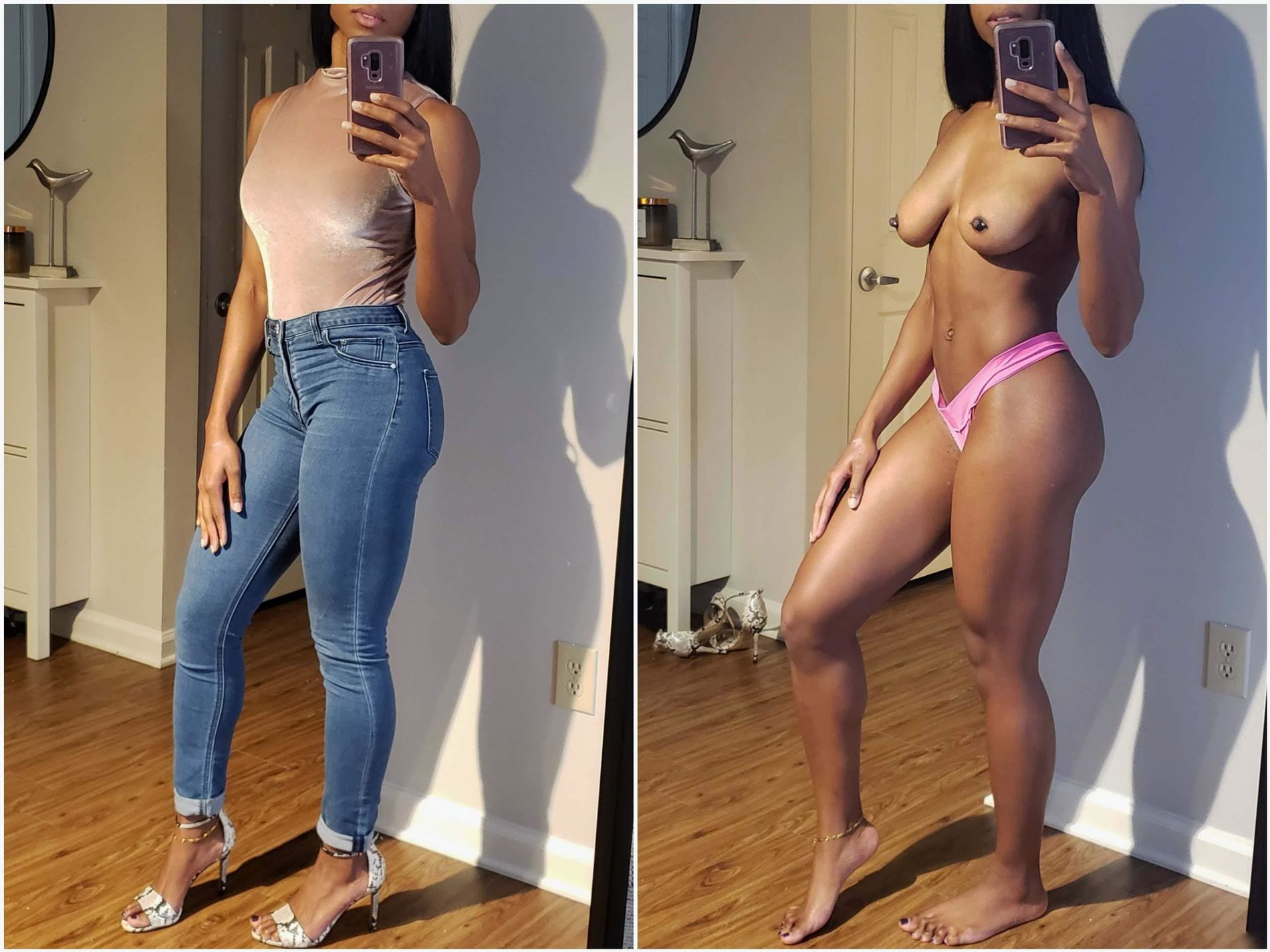 темнокожая фитоняшка демонстрирует своё сексуальное тело в разной одежде и без