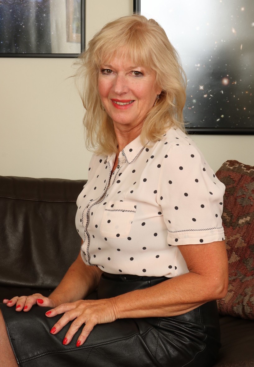 Зрелая блондинка раздевается и раскрывает пальцами свою киску на диване