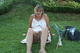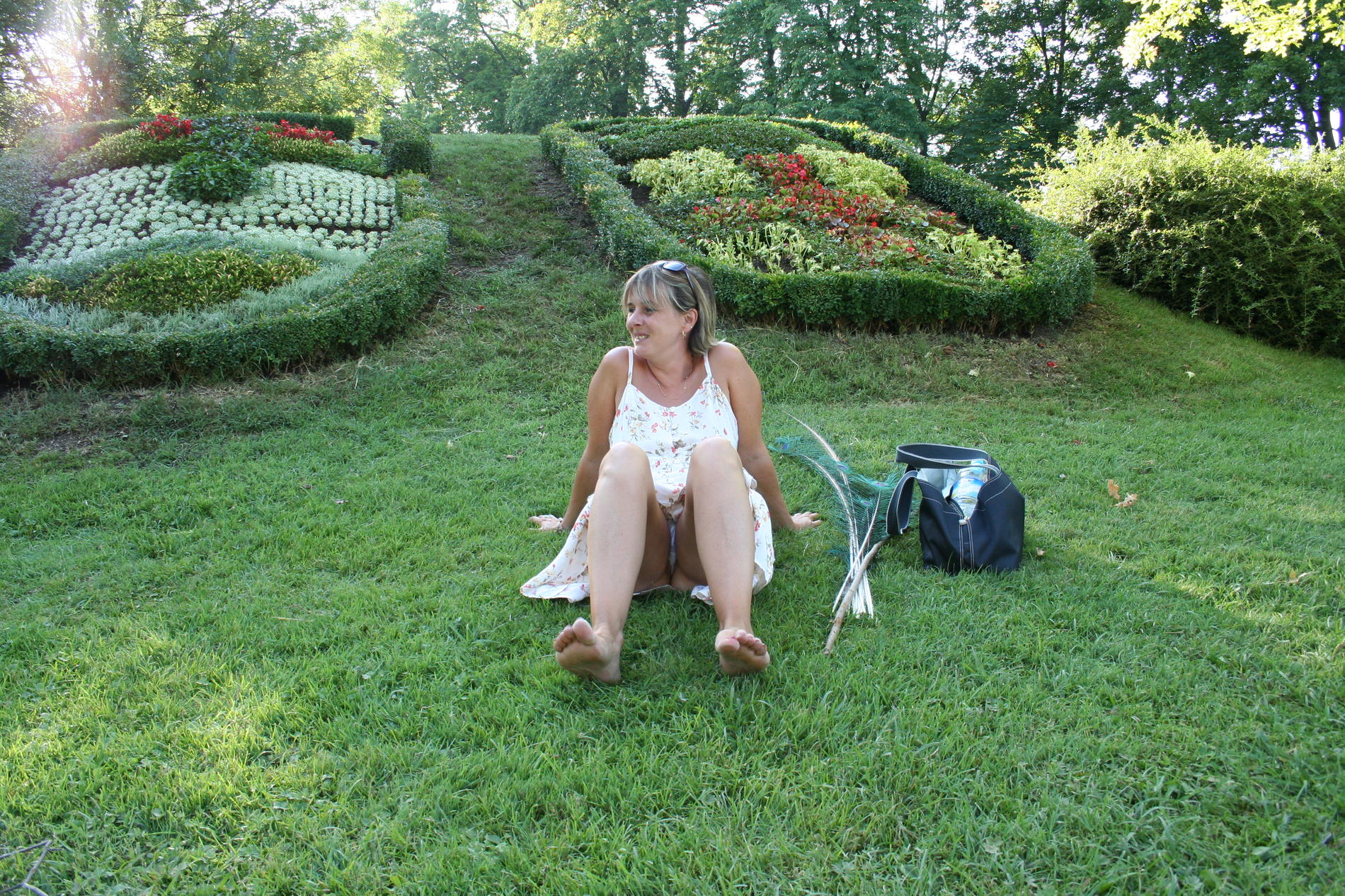 Зрелая дамочка делает небольшие засветы своих прелестей расположившись на газоне.