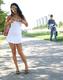 В очень коротком белом платье.