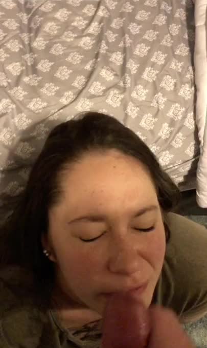Сосет хуй и подставляет лицо под выстрелы спермы