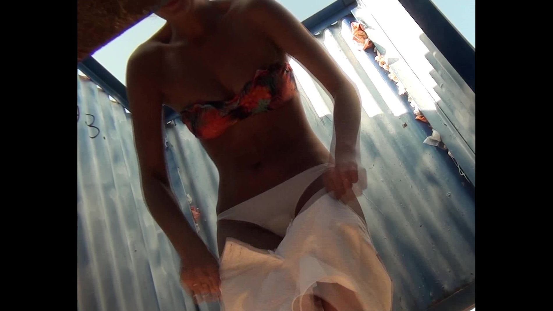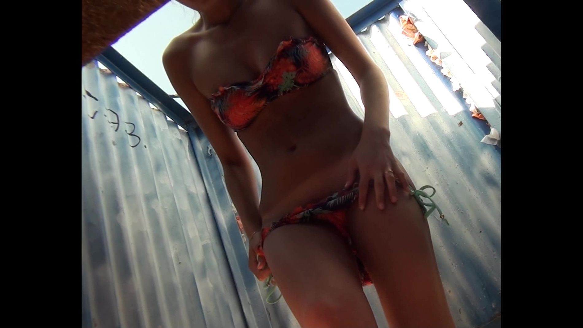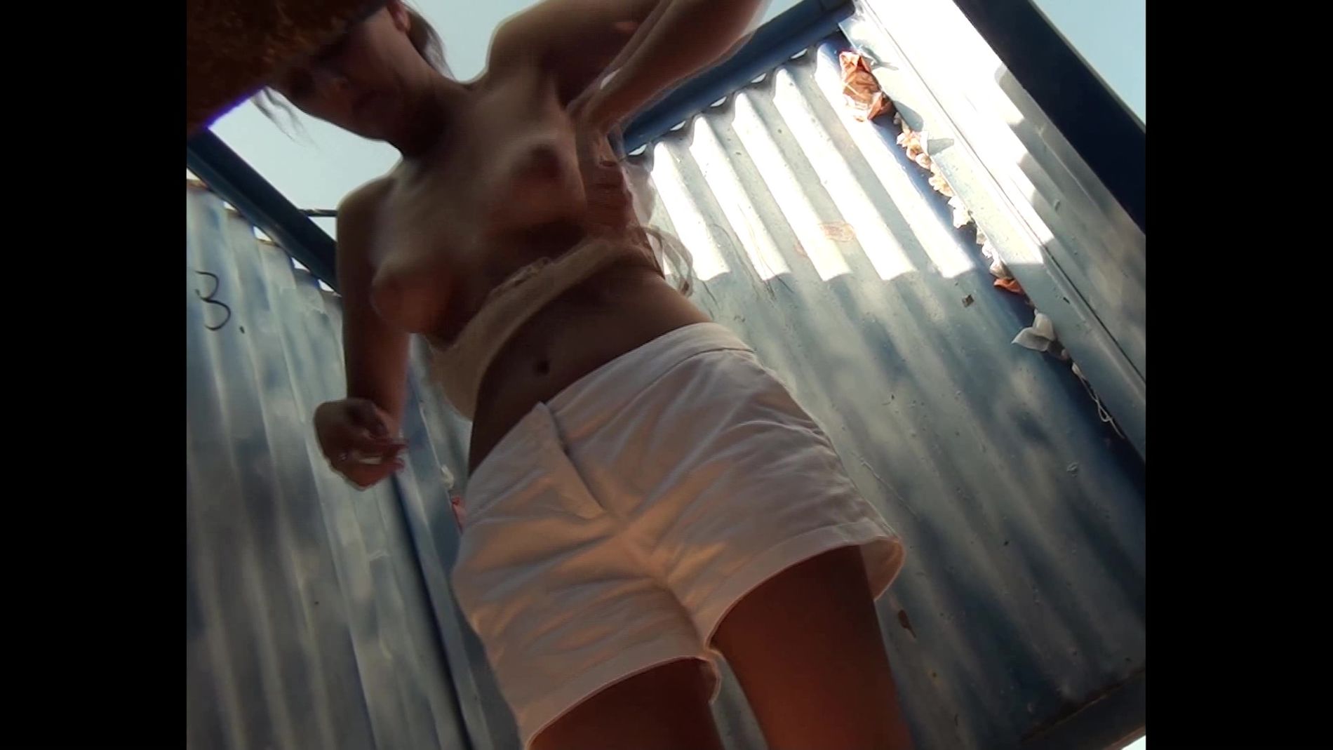 Бритая киска и девичья грудь подловлены на скрытую камеру. Пестрый купальничек и блузка добавляют толику эротизма в это забавное пляжное видео вкупе с белым бельем и белыми шортиками. Смотрите и фантазируйте.