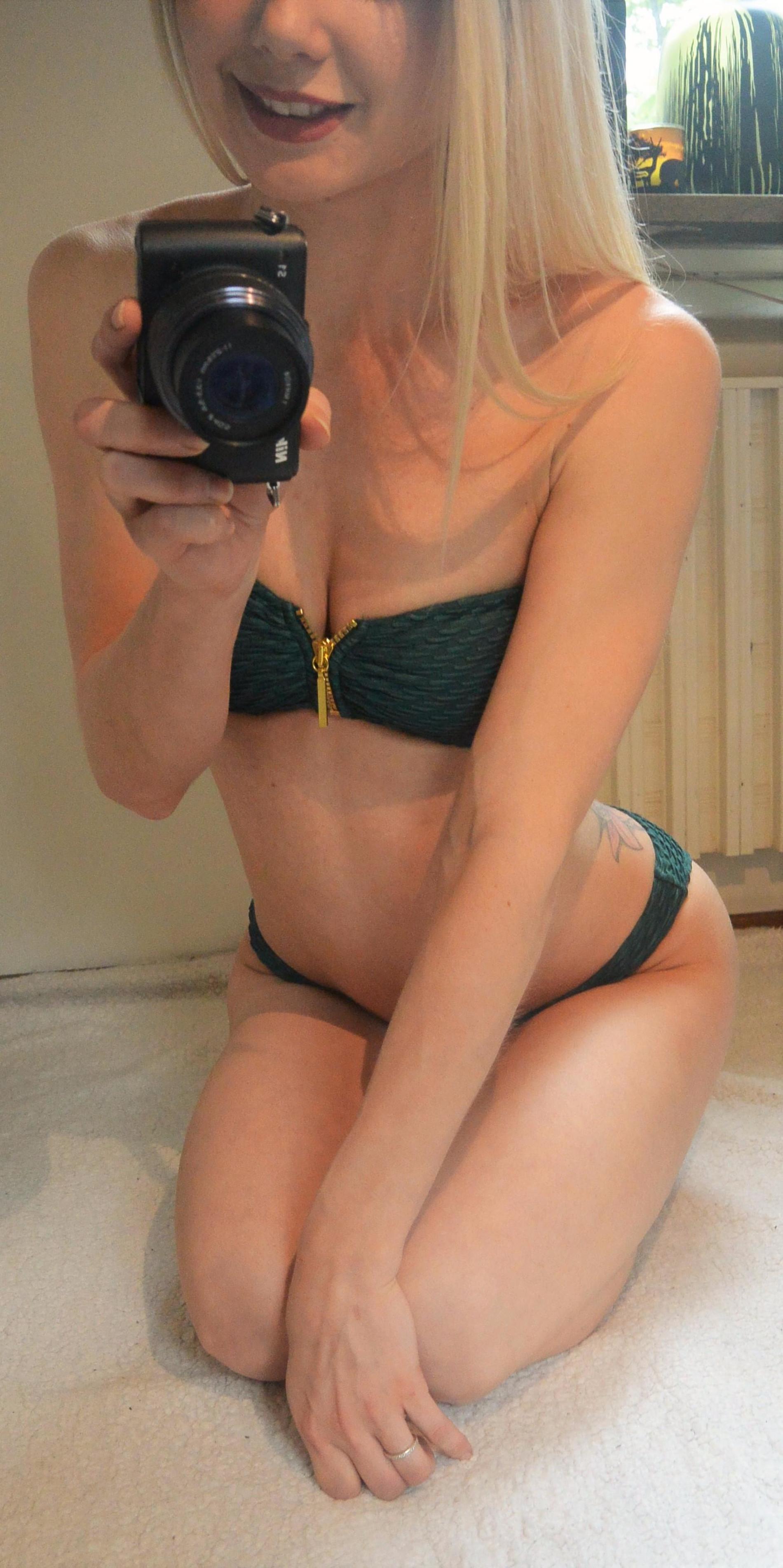 белокурая красотка красуется в своих купальных нарядах
