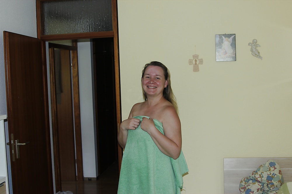 зрелая дама весело и без стеснения позирует в одном полотенце!