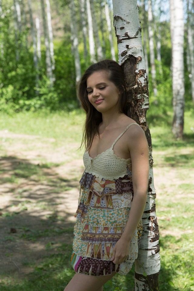 Обнажённая молоденькая красоточка очень желанной выглядит в берёзовом лесочке!