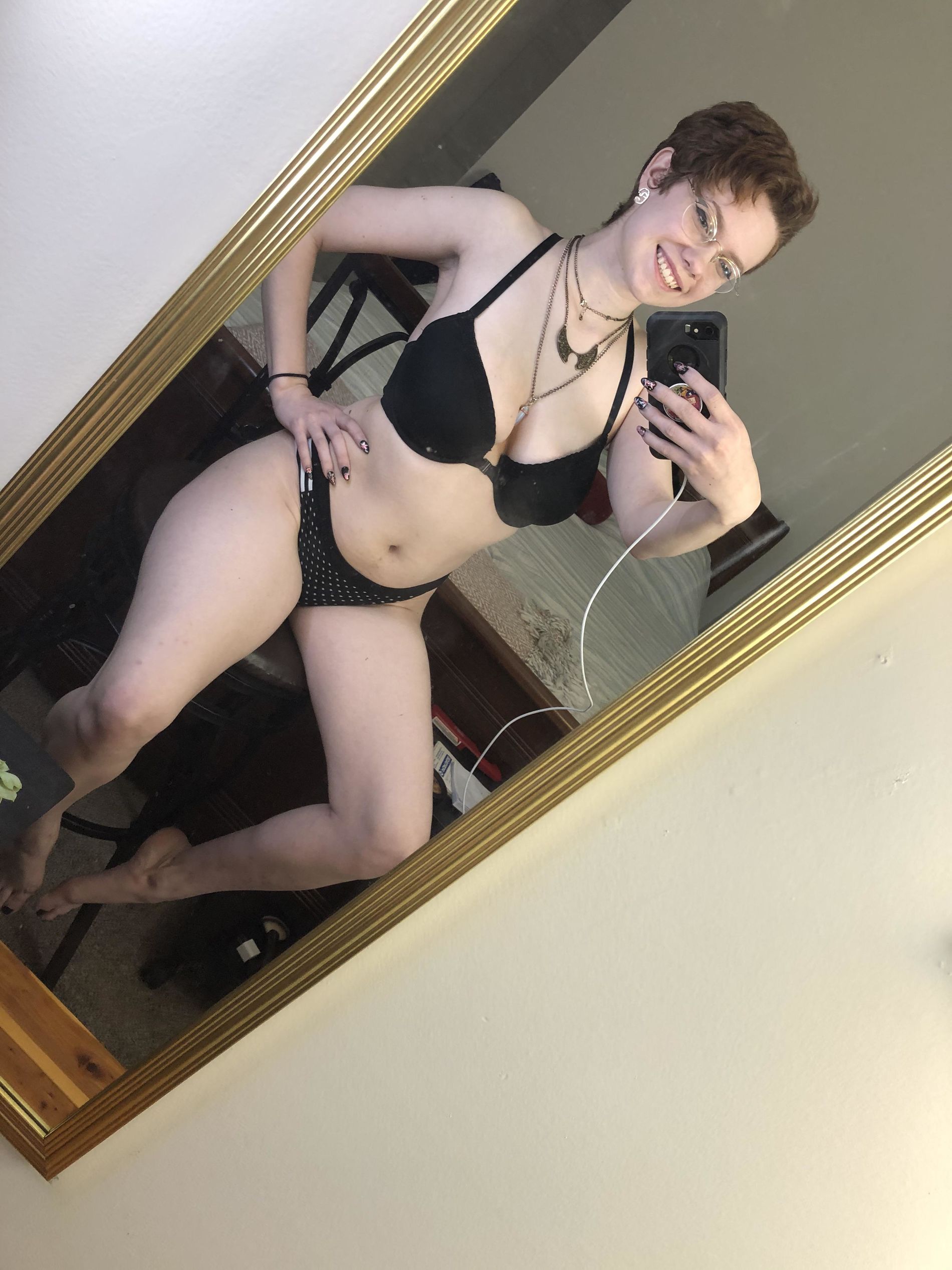 девушка в очках делает селфи перед зеркалом демонстрируя своё сексуальное тело и свою хорошую грудь