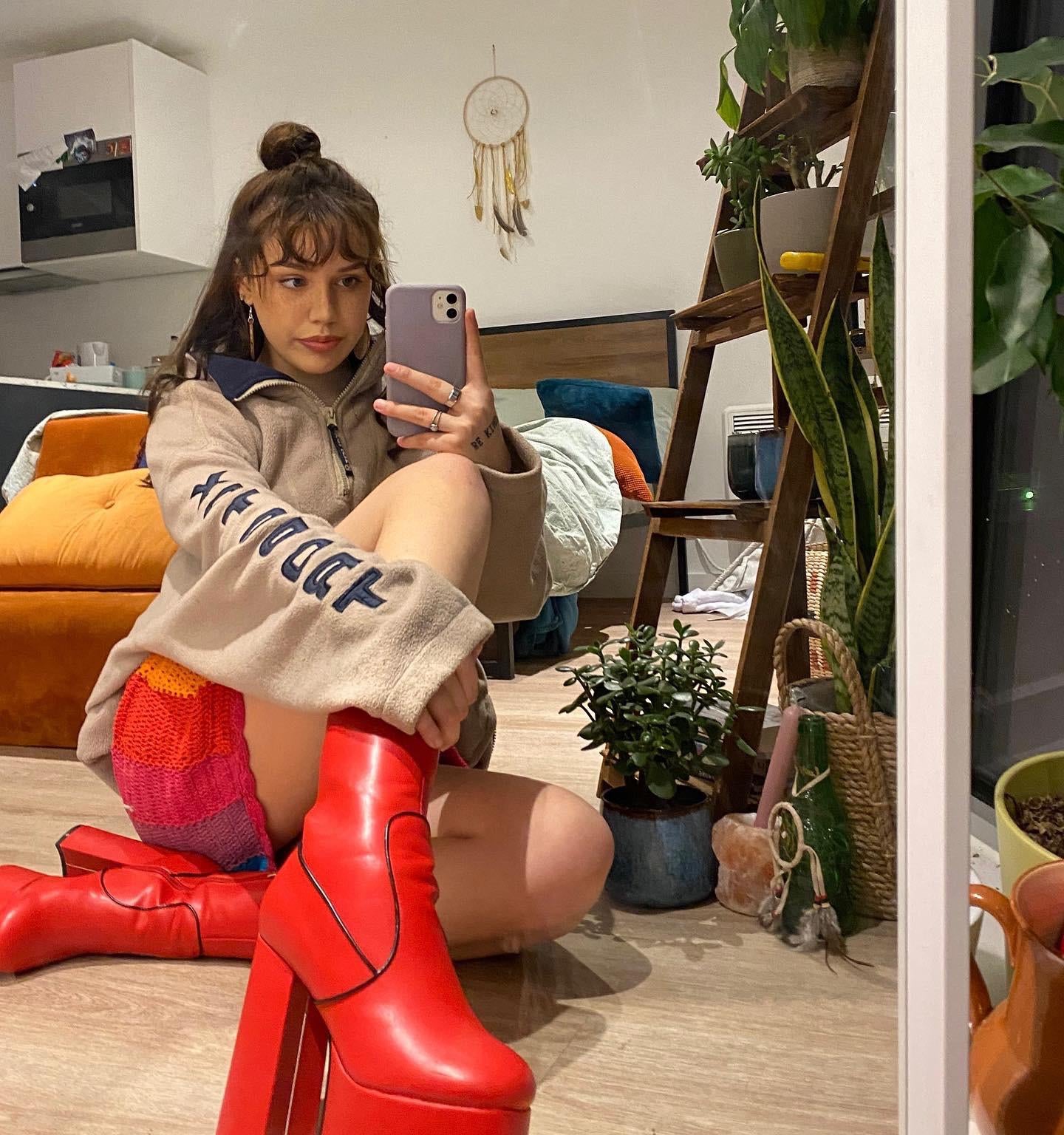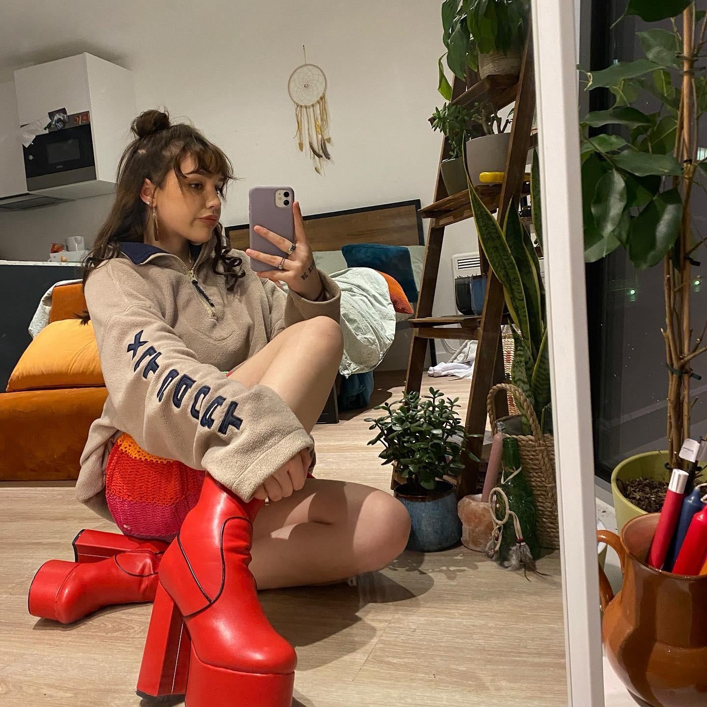 веснушки на лице и смартфон в руке,девица демонстрирует своё соблазнительное тело и снимает селфи
