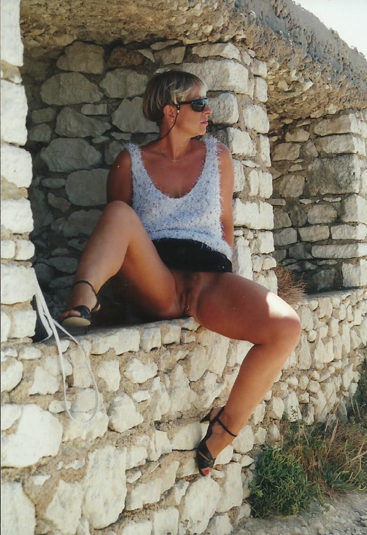 дама без комплексов гуляет без трусиков и позирует на фотокамеру.