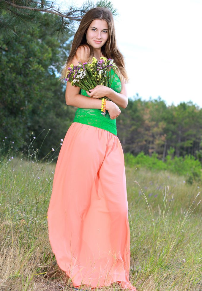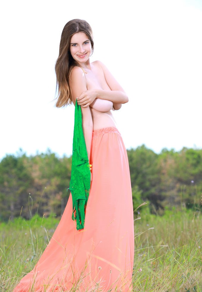 Марта в сексуальной юбке обнажает большие сиськи и бритую киску на природе