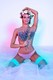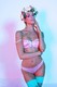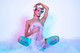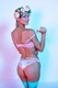 в сексуальном наряде и голубых чулках, на красивом фоне показывает нам красоту своего обнаженного тела