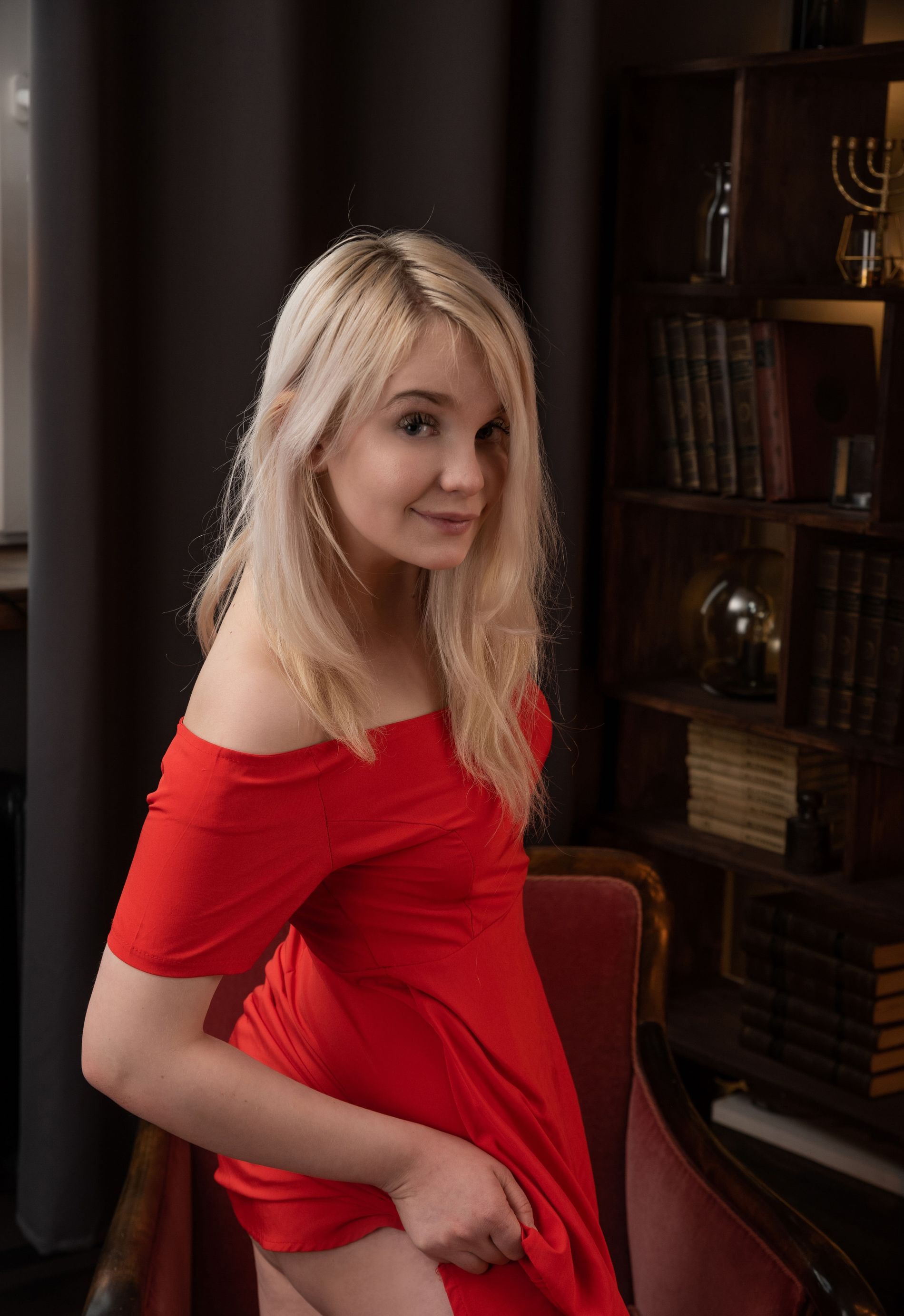 Девушка на красном стуле