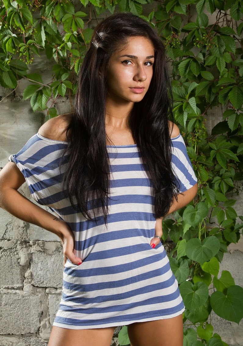 Красотка снимает тунику чтобы порелаксировать на залднем дворе дома