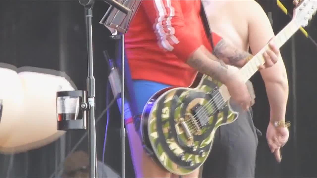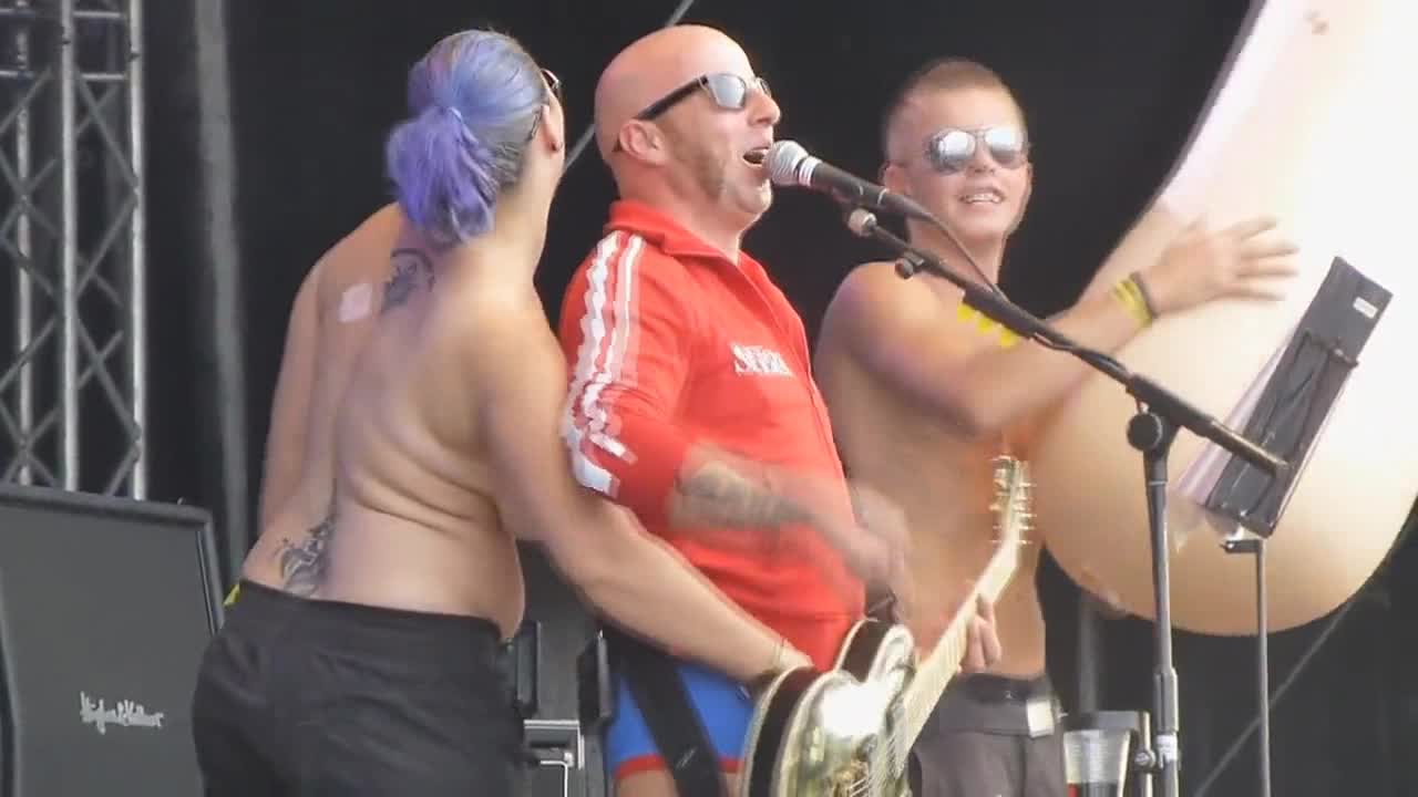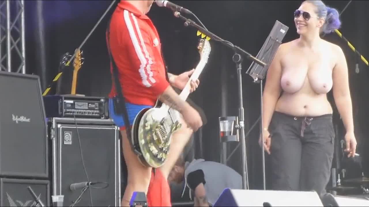 Пока группа играет на сцене, выходит фанатка с голой грудью и танцует на радость публике.