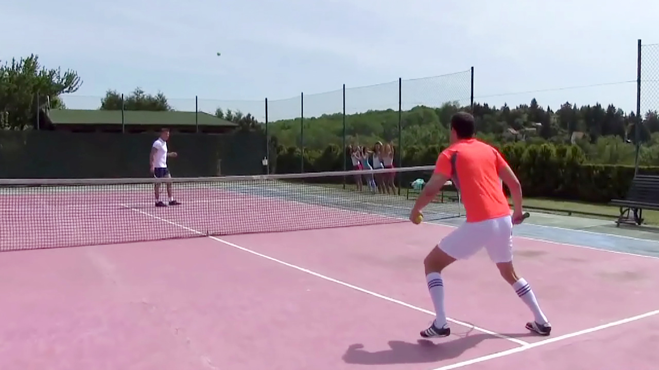 Два парня играли в теннис и в это время девочки пришли поболеть за них и взять автографы,сначала просто на бумаге,затем на их сладких телах,за это красавицы угостили их клубничкой со сливками,только сливки наносили себе на попку,грудь и киску,от чего парни уже не могли скрывать свое возбуждение, девушки заметили,что у парней стоят члены и тут понеслась. По две девушки сосали у них,а парни трахали по очереди каждую свою фанатку прямо там,на теннисном корте